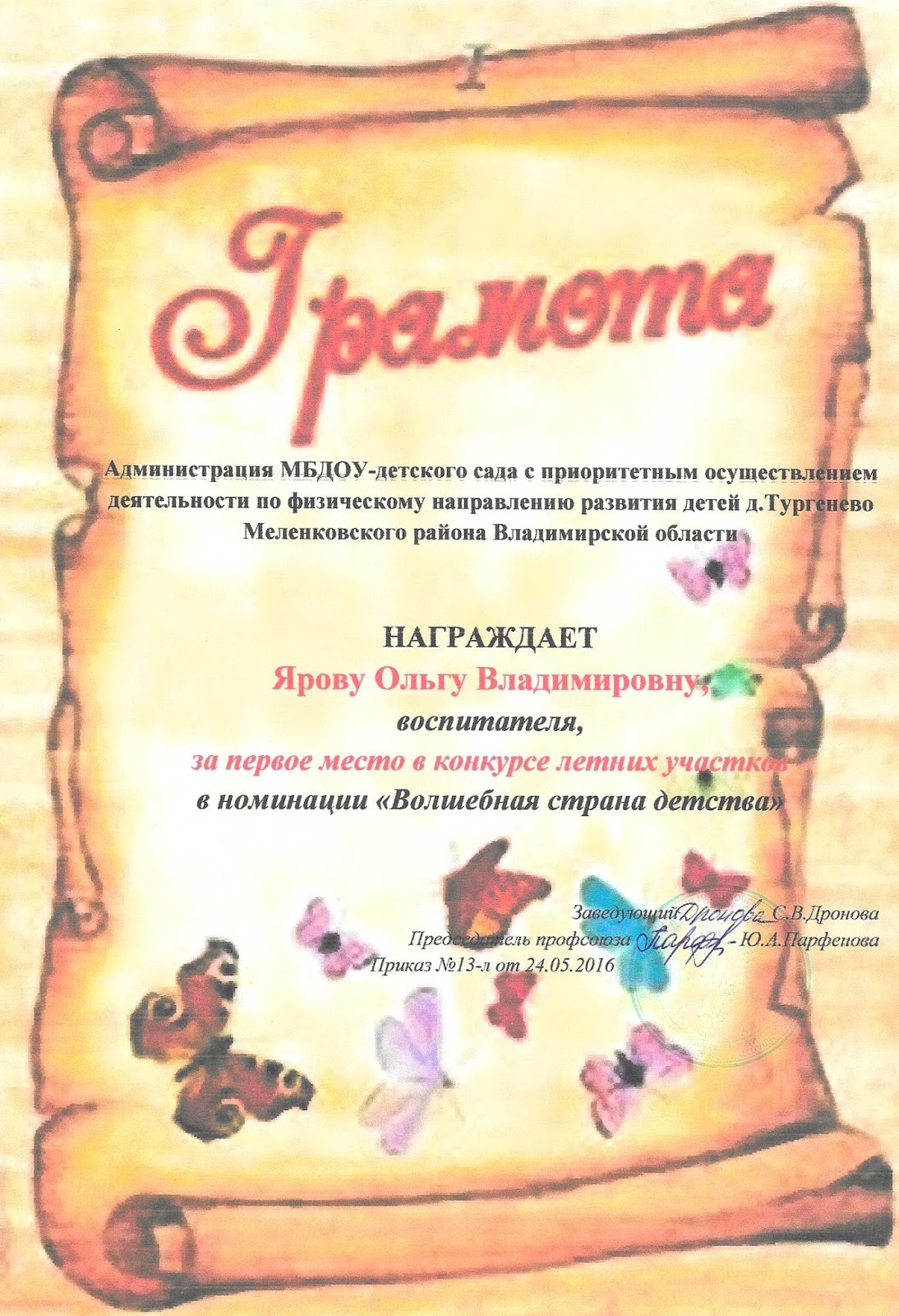 - Грамота управления образования администрации Меленковского района